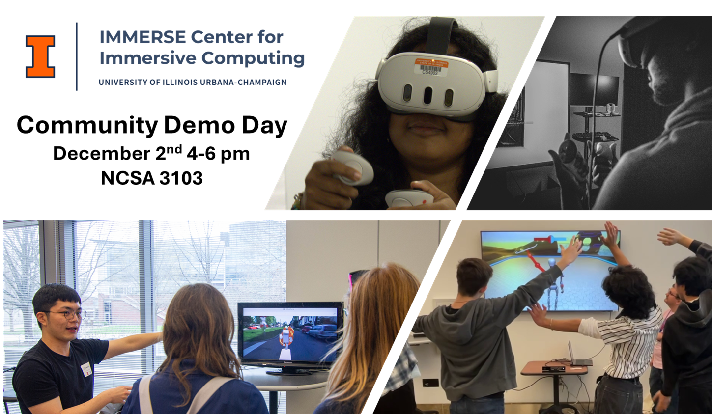 On December 2nd from 4-6 PM IMMERSE will be hosting an immersive demo open house in its NCSA 3103 lab space. Stop by during the event for opportunities to get hands on with some current immersive computing projects on campus across all stages of development, talk to the teams supporting the work, and boost your connections across the IMMERSE community.