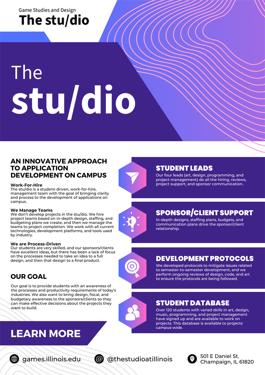 The stu/dio is a student-driven, work-for-hire, management team with the goal of bringing clarity and process to the development of games and immersive applications on campus. We hire project teams based on in-depth design, staffing, and budgeting plans we create, and then we manage the teams to project completion. We work with all current technologies, development platforms, and tools used by industry. Our students are very skilled, and our sponsors/clients have excellent ideas, but there has been a lack of focus on the processes needed to take an idea to a full design, and then that design to a final product.