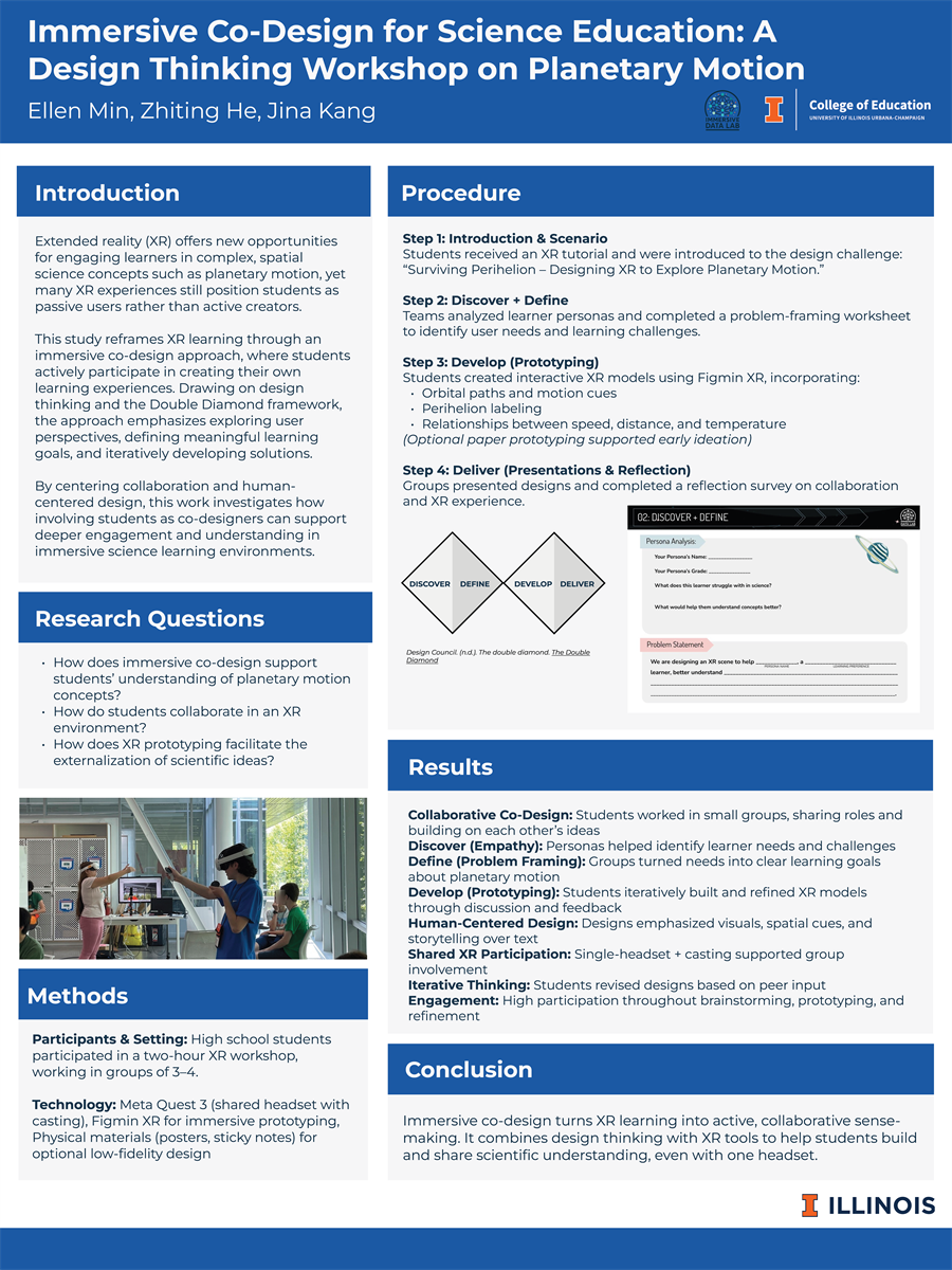 Students participated in a structured design challenge, “Surviving Perihelion – Designing XR to Explore Planetary Motion,” grounded in a narrative scenario of a spacecraft approaching the Sun. Following a brief tutorial on XR interaction and 3D manipulation, teams moved through phases of design thinking. In the Discover phase, students examined learner personas to identify specific needs. In Define, they articulated design goals related to key concepts such as orbital speed, perihelion, and distance–temperature relationships. During Develop, groups used Figmin XR to collaboratively prototype interactive 3D representations, incorporating spatial features such as orbital paths, motion cues, and visual indicators.